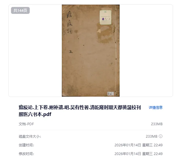瘟疫论.上下卷.附补遗.明.吴有性著.清乾隆时期天都黄晟校刊醒医六书本.pdf