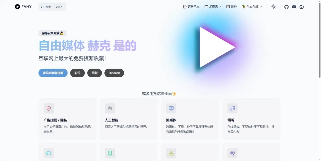 简单说,fmhy(FreeMediaHeckYeah)来自Reddit热社区,由GitHub仓库实时更新。不是乱七八糟的链接堆砌,而是精心分类的资源地图——流媒体、游戏、书籍、教育、工具,应有尽有。无论你是追剧党、游戏玩家还是自学者,这里都能一站搞定。站点设计简洁,支持搜索、书签和 RSS 订阅,移动端友好。
