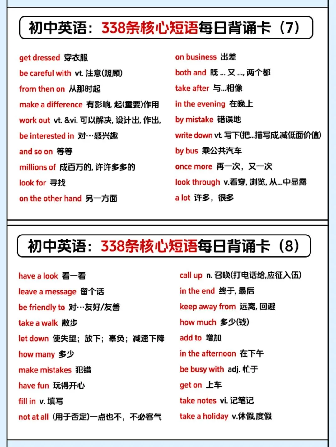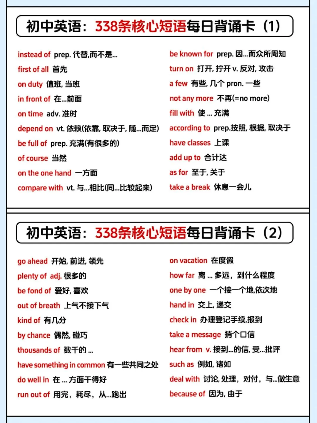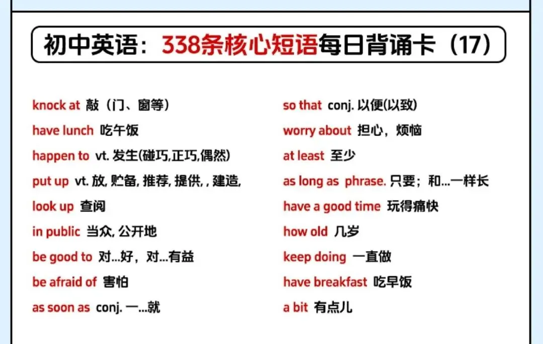 【资源分享】一张表记完初中338条英语核心短语,学霸都在偷偷背! 每日订阅,关注我吧↓ 初中开始,短语搭配逐渐成为考试中的绝对重点内容。掌握短语、固定搭配不仅对于听力、阅读很有帮助,更能让英语作文拿高分! 牢记英语短语势在必行,今天就给大家分享一套初中英语必背的338条核心短语每日背诵卡,赶紧收藏起来慢慢背!! 文末有高清电子版领取 本文资源领取方法 〔无需转发、分享〕 第①步: 文末「点赞」和「在看」 第②步:👇进资源库一键开放领取 整理不易,点点“赞”哦~