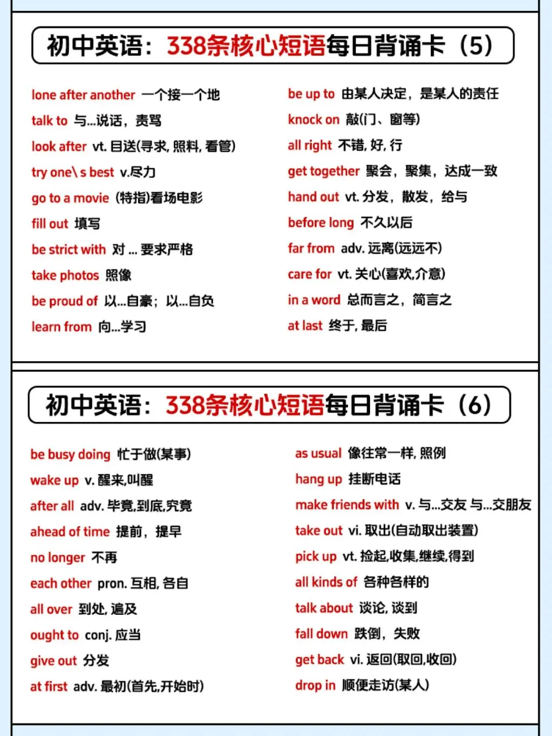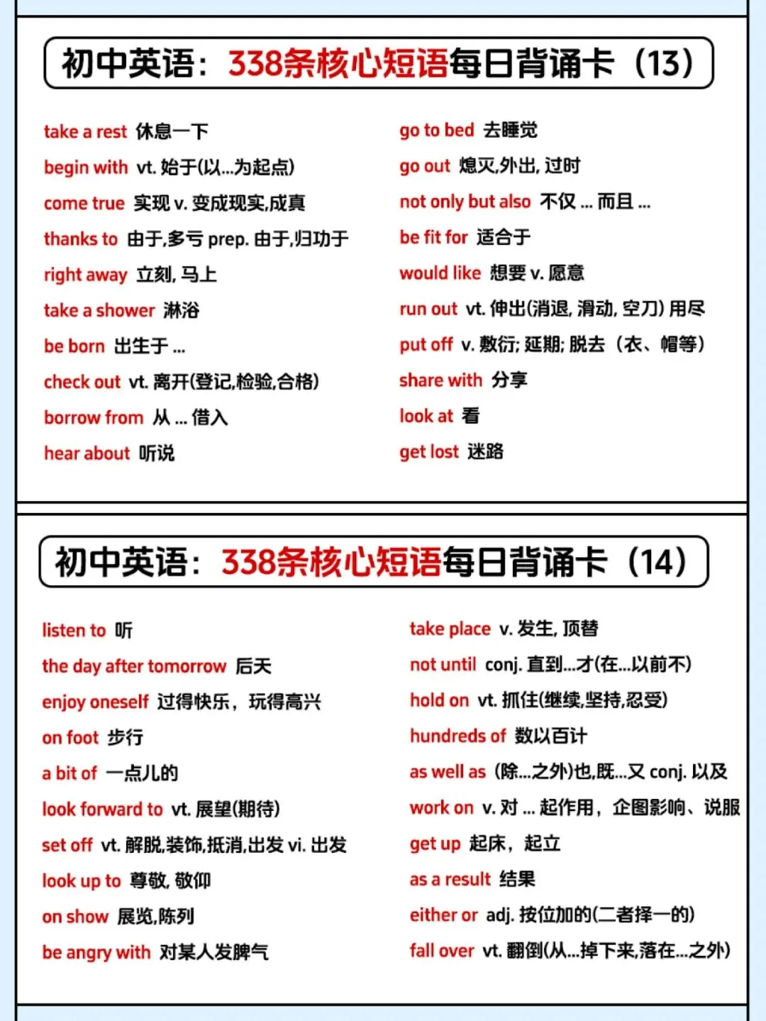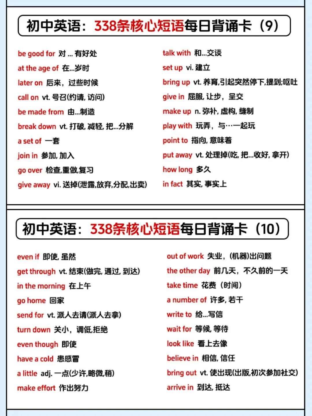 【资源分享】一张表记完初中338条英语核心短语,学霸都在偷偷背! 每日订阅,关注我吧↓ 初中开始,短语搭配逐渐成为考试中的绝对重点内容。掌握短语、固定搭配不仅对于听力、阅读很有帮助,更能让英语作文拿高分! 牢记英语短语势在必行,今天就给大家分享一套初中英语必背的338条核心短语每日背诵卡,赶紧收藏起来慢慢背!! 文末有高清电子版领取 本文资源领取方法 〔无需转发、分享〕 第①步: 文末「点赞」和「在看」 第②步:👇进资源库一键开放领取 整理不易,点点“赞”哦~
