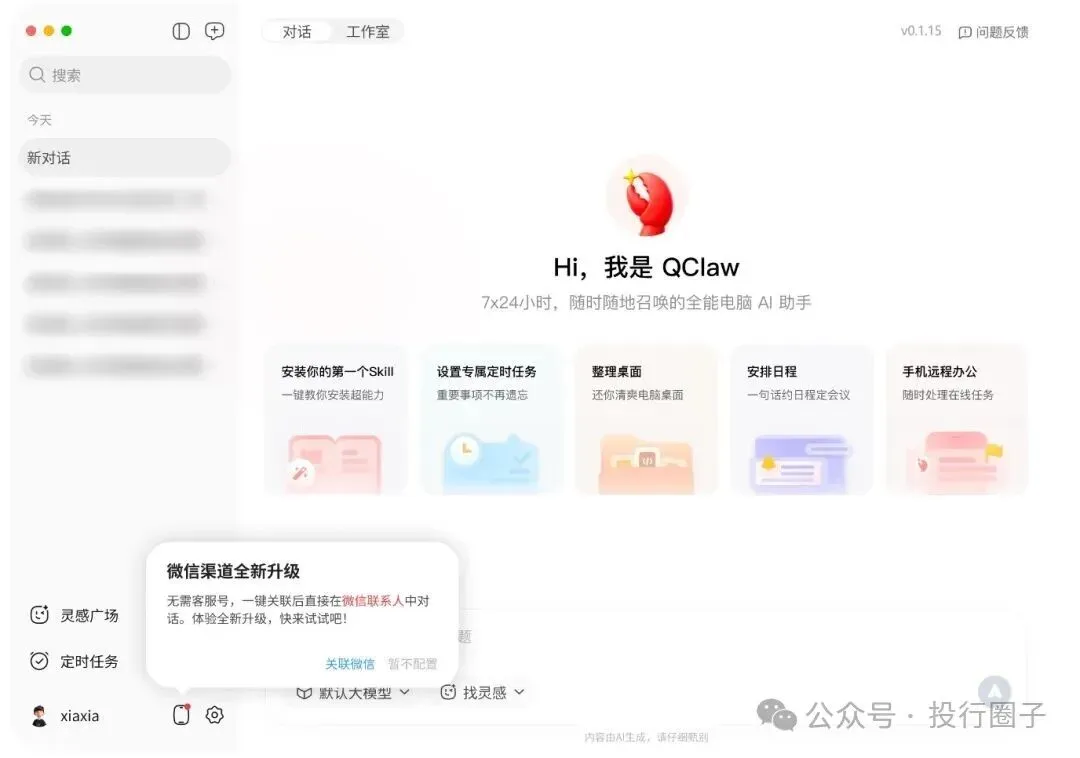 QClaw桌面端(v0.1.15版本)→左下角弹窗→扫码直连