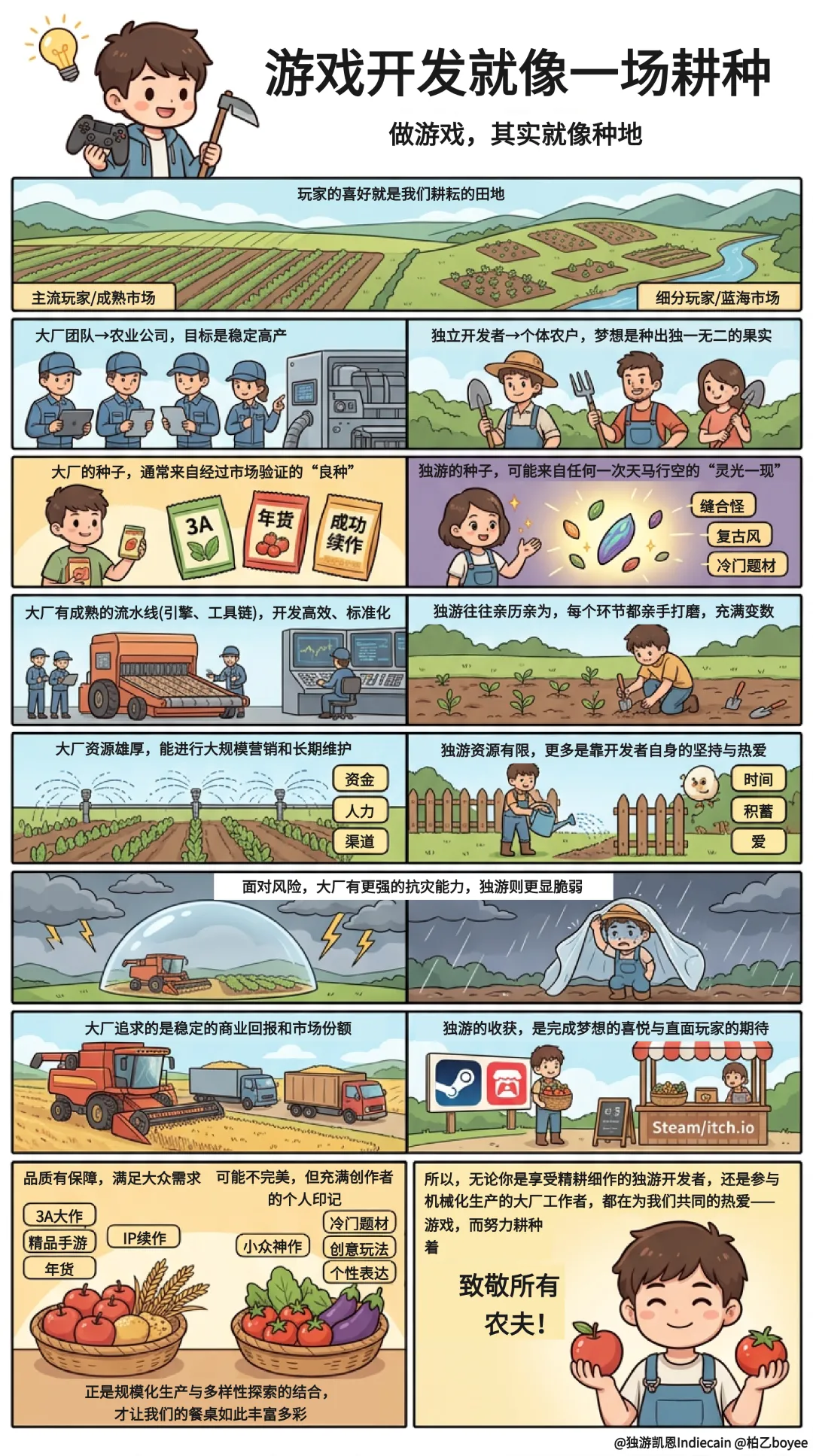【漫画】游戏开发就像一场耕种 商业游戏和独立游戏并非零和博弈 对于开发者来说更是如此 大厂的管线值得独游人学习 独立精神也是大厂作品需要逐渐增加的 希望游戏行业能变得更好 希望所有开发者都能做出让自己满意的作品 感谢柏乙老师提供的灵感♥