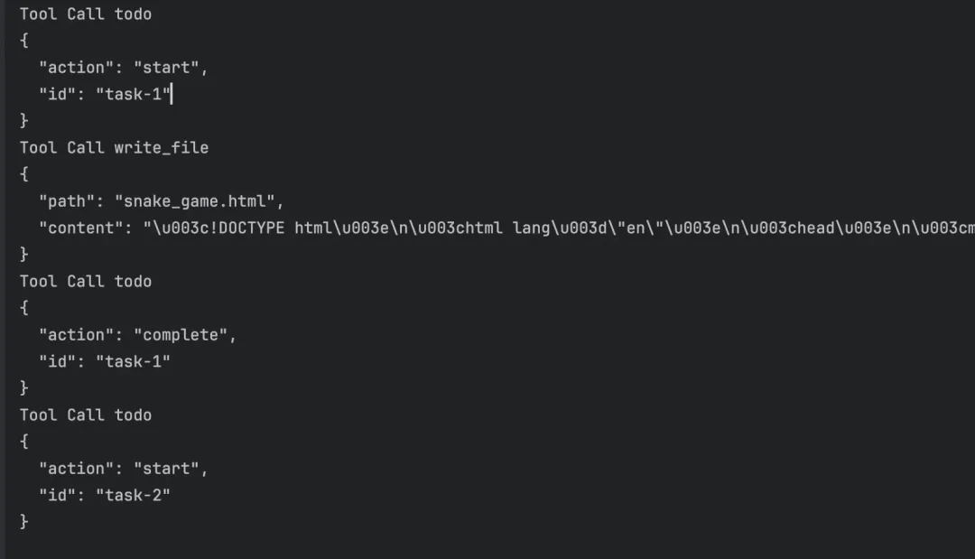 public final class TodoManager { public enum Status { PENDING, IN_PROGRESS, COMPLETED, CANCELLED } public static final class TodoItem { private final String id; private String title; private Status status; // ... } private final Listitems = new ArrayList<>(); private int nextId = 1; // 新增任务 public synchronized TodoItem add(String title) { TodoItem item = new TodoItem("task-" + nextId++, title); items.add(item); return item; } // 启动任务:强制同一时间只有一个in_progress public synchronized TodoItem start(String id) { TodoItem target = findById(id); TodoItem inProgress = findInProgress(); if (inProgress != null && !inProgress.id.equals(target.id)) { throw new IllegalStateException( "another task already in_progress: " + inProgress.id); } target.status = Status.IN_PROGRESS; return target; } // 完成任务:必须先in_progress才能complete public synchronized TodoItem complete(String id) { TodoItem target = findById(id); if (target.status != Status.IN_PROGRESS) { throw new IllegalStateException( "task must be in_progress before complete: " + target.id); } target.status = Status.COMPLETED; return target; } // 生成快照供模型查看 public synchronized JsonObject snapshot() { JsonObject out = new JsonObject(); JsonArray arr = new JsonArray(); // 统计各状态数量... out.add("items", arr); out.addProperty("summary", summaryText()); return out; }}