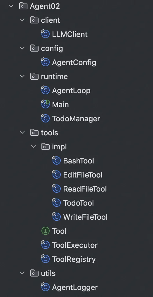 参考项目:learn-java-agent/Agent02核心类:Tool.java、ToolRegistry.java、TodoManager.java、AgentLoop.java
