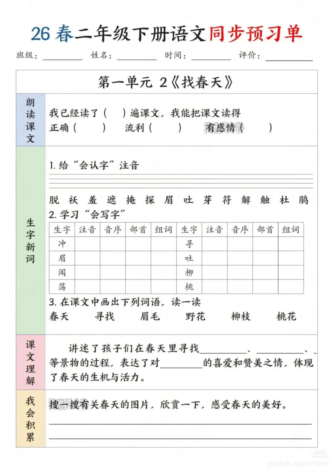 2026春二年级下册语文同步预习单PDF高清可打印版,人教版生字注音组词课文理解日积月累完整版免费领