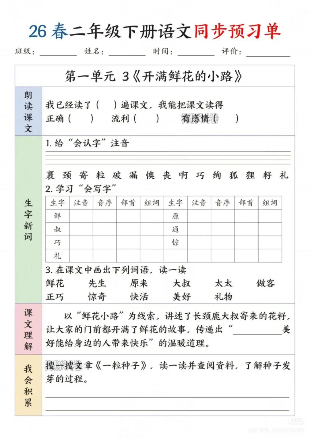 孩子语文预习抓不住重点?家长辅导没方向?这份由一线老师内部整理的二年级下册语文同步预习单,正是解决你焦虑的“及时雨”,让孩子课前高效预习,课后轻松巩固!