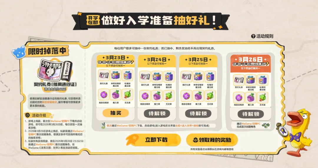 抽奖资格需要在大家首次下载后启动才会生效,每日可以获得1次,且3月26日会额外加量,所以千万别错过