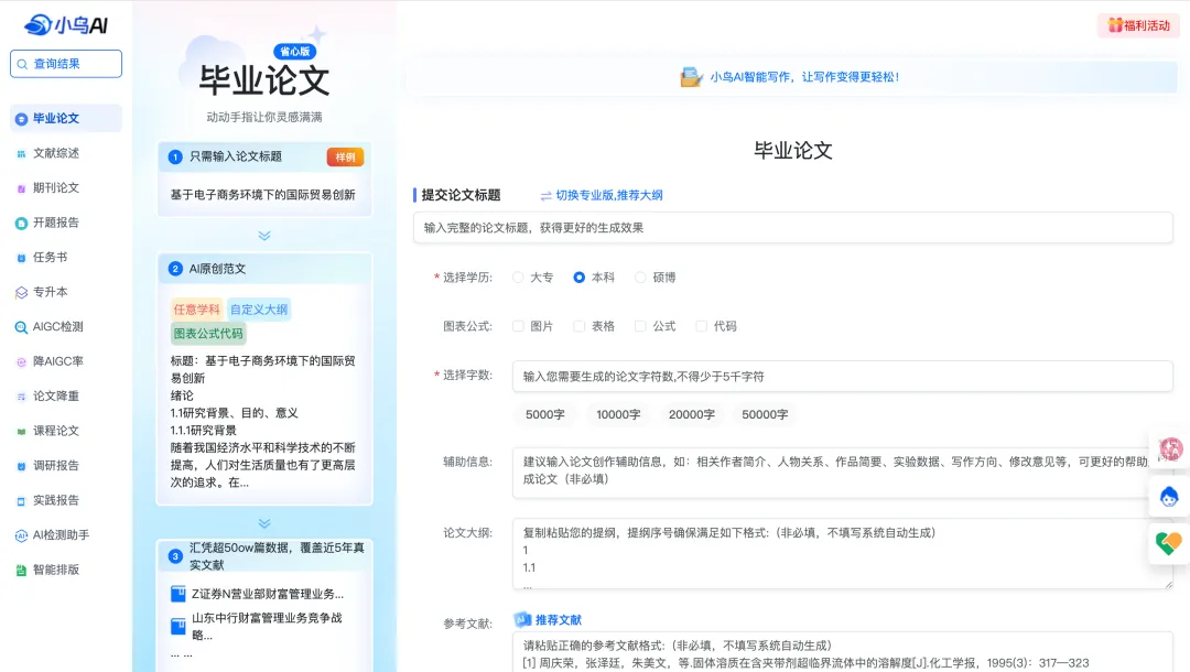 毕业论文不是人生的终点,而是学术能力的起点。小鸟AI帮你省下时间,让你有更多精力去完善内容、提升质量。工具用对了,效率翻倍,论文轻松搞定!
