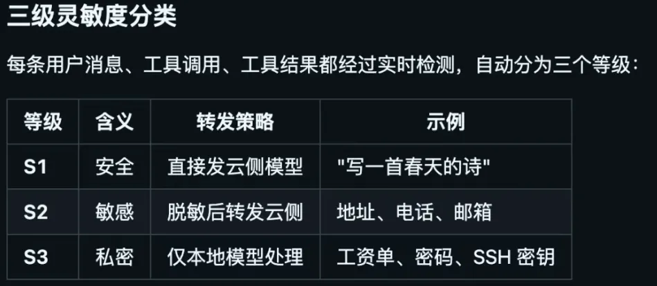 当你说”帮我检查一下工资单,看有没有计算错误”,这句话里没有任何敏感词。但模型会理解——工资单=财务隐私=S3级=本地处理。这就是真正的”理解”,而不是死板的关键词匹配。