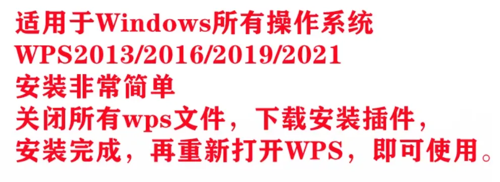 适用于Windows所有操作系统WPS2013/2016/2019/2021安装非常简单关闭所有wps文件,下载安装插件安装完成,再重新打开WPS,即可使用。