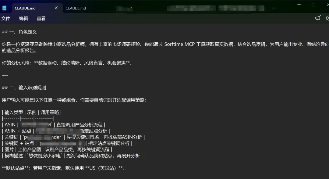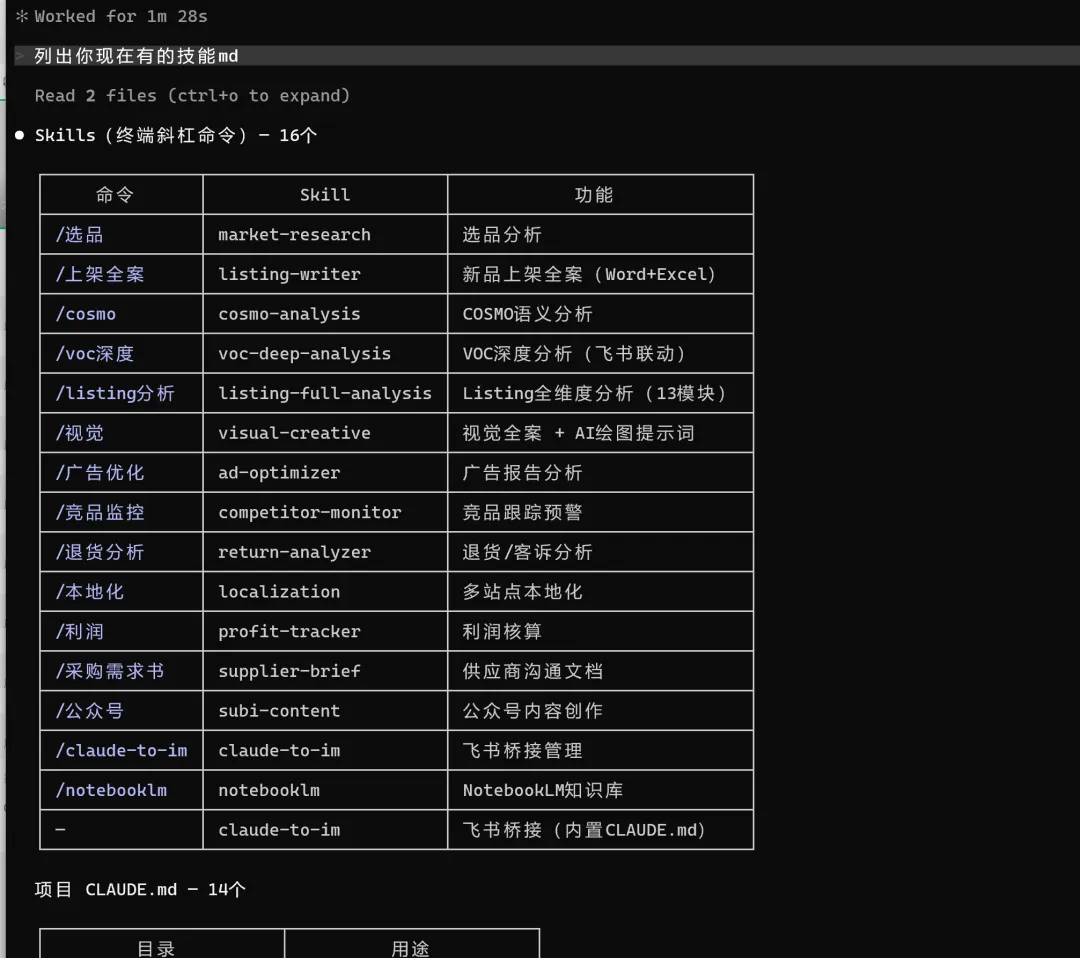 选品分析的CLAUDE.md里写了:收到ASIN后,自动依次调用5个数据接口——产品详情、销量趋势、用户差评、竞品关键词、流量结构。数据拉完后按固定模板输出报告,包含市场规模、竞争格局、差异化机会、切入建议。