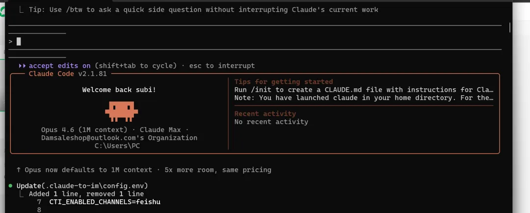 用的工具叫 claude-to-im,一个开源的桥接方案。在Claude Code终端里输入 /claude-to-im setup,按提示填入飞书应用的 App ID 和 App Secret,然后 /claude-to-im start,桥接就跑起来了。