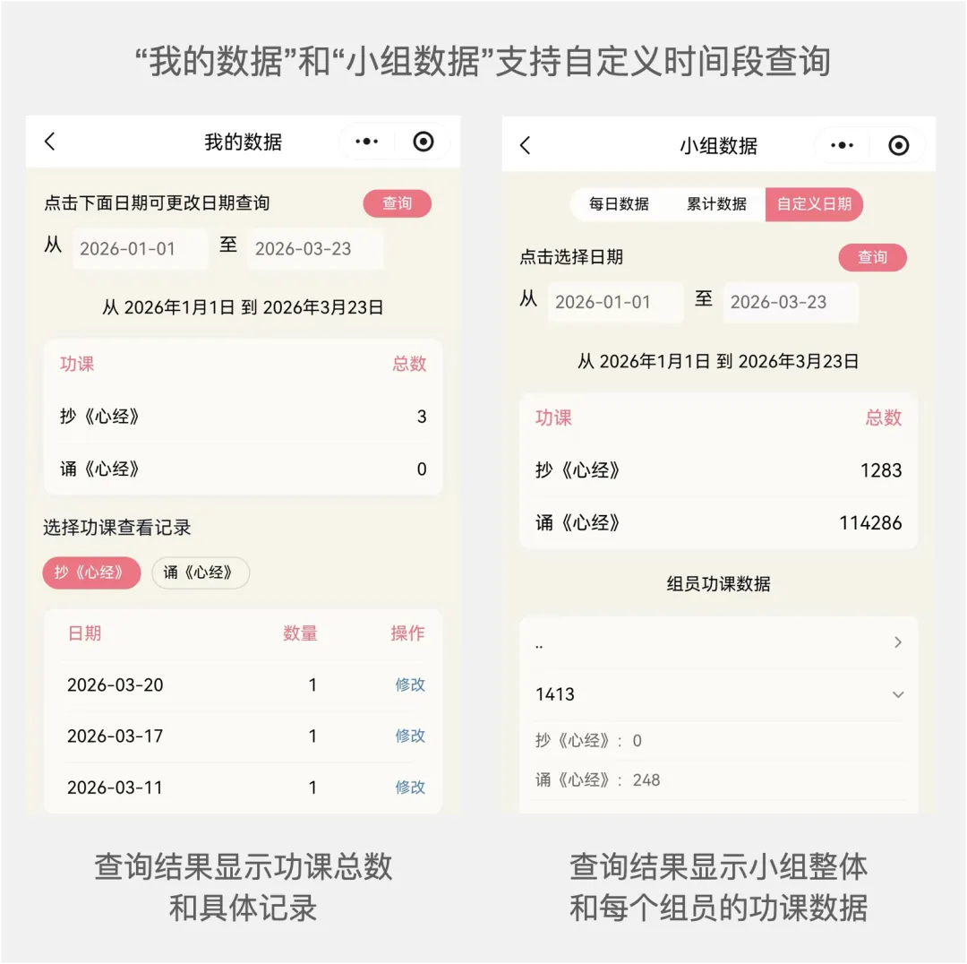 如果您是群主或者管理员,需要经常按不同时间段统计成员功课情况,除了通过导出表格统计外,现在也支持了直接在小程序里快速查询。
