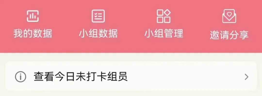 每天晚上群主和管理员就可以看到“查看今日未打卡组员”的菜单,点击进去会列出今日未打卡的组员信息,包括未打卡的天数。可以一键复制所有组员的名字发到微信群里,如果组员昵称跟微信群昵称相同,就可以提醒对方打卡。