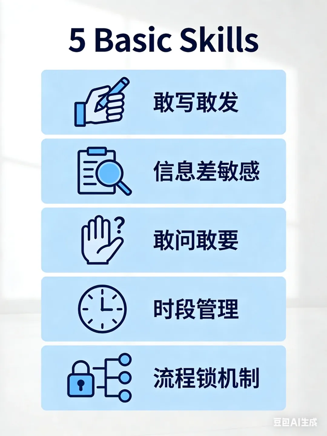 – 敢写敢发、信息差敏感、敢问敢要、时段管理、流程锁机制