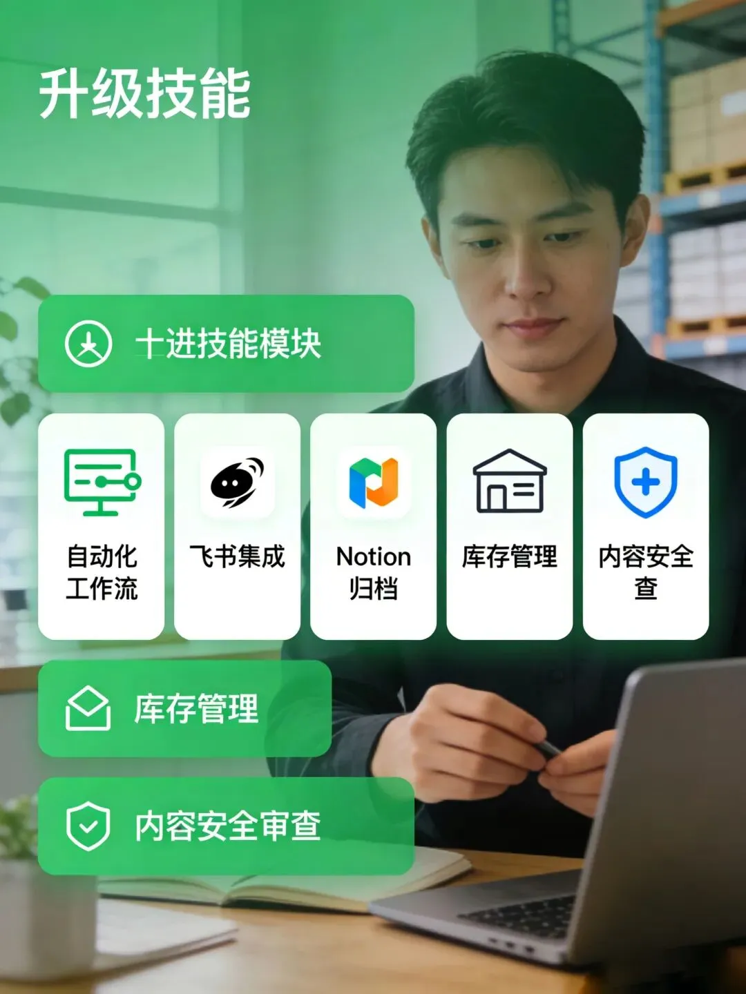 – 自动化工作流、飞书集成、Notion 归档、库存管理、内容安全审查