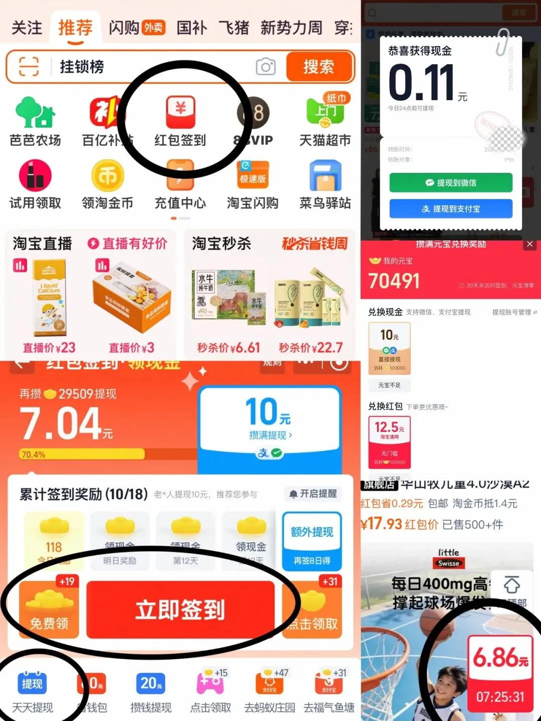 操作步骤:打开淘宝APP → 首页直接点击“红包签到”或顶部搜索“红包签到” → 进入签到页面,点击“立即签到”。想要提升效率,可点击“立即签到”左侧的“免费领”,完成任务赚元宝。满10万元宝可直接兑换10元现金红包或淘宝通用无门槛红包,无任何使用限制。