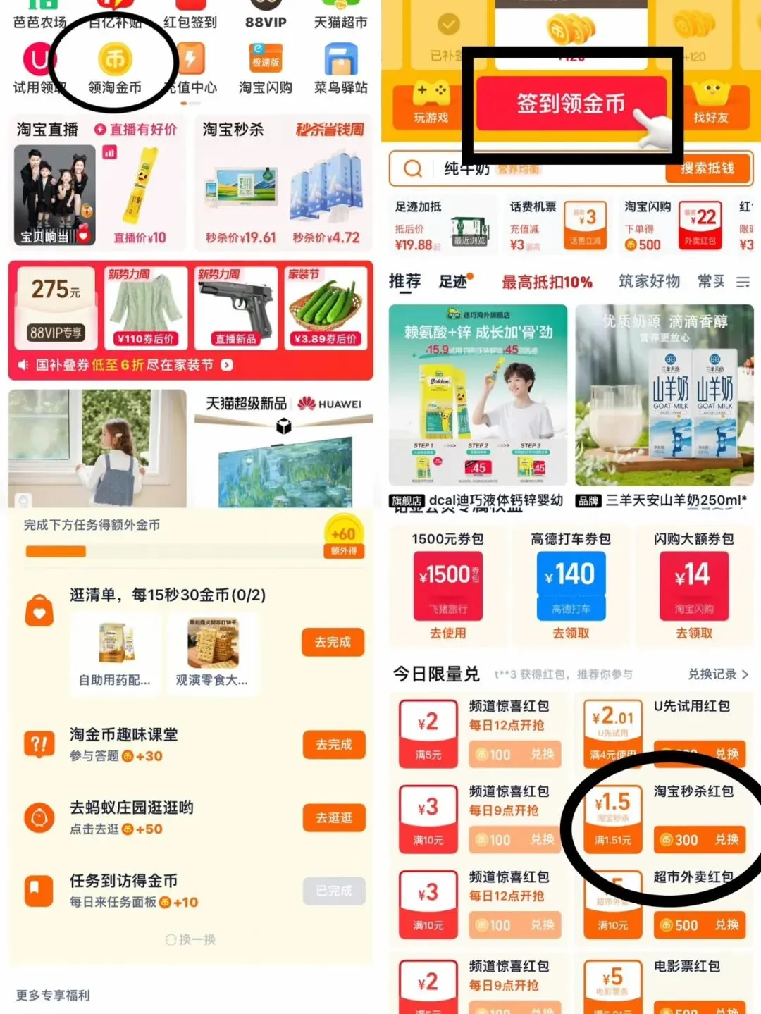 操作步骤:淘宝APP → 首页点击“领淘金币”或者搜索“淘金币” → 先完成“签到淘金币”,再点击“赚更多金币”,完成简单任务攒金币,还可以用金币兑换红包。