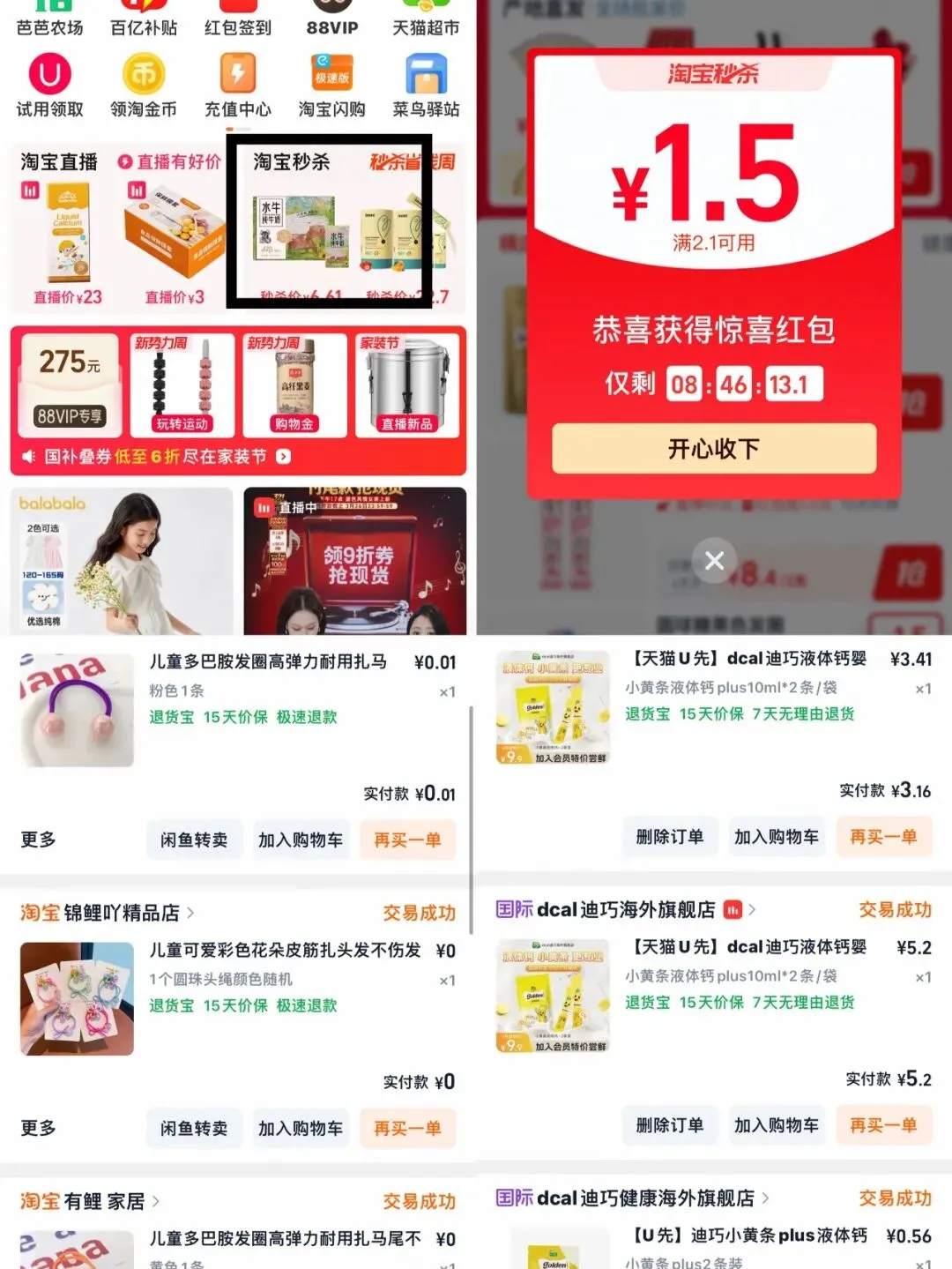 小提示:秒杀频道的红包一般当天过期,建议领取后直接找到合适的商品下单消耗掉,避免过期浪费;我一般给孩子买皮筋发卡或者液体钙、发酵粉之类的,性价比超高。