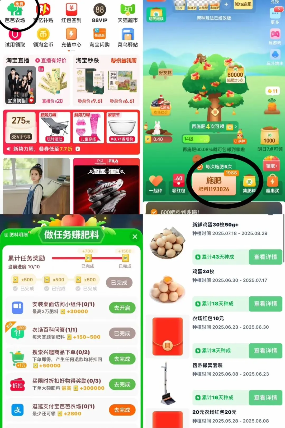 操作步骤:淘宝APP → 首页点击“芭芭农场”或者搜索“芭芭农场” → 领取果树后,完成签到、浏览商品等任务获取肥料,每天施肥,让果树成长即可。