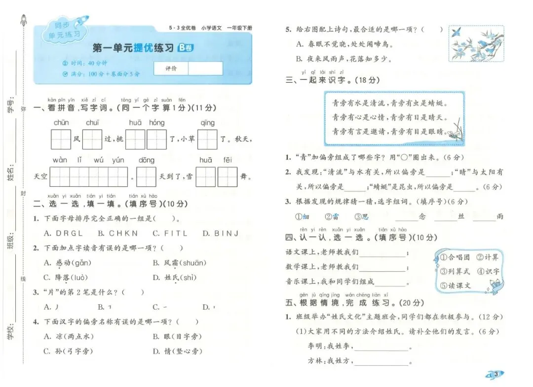 试卷结构完整,包含单元卷、专项卷、期中期末模拟卷,形成学、练、测一体化复习路径。单元卷同步教学进度,及时检测学习效果;专项卷针对拼音、字词、句子、阅读、写话等重点模块集中训练,精准突破薄弱点;期末卷题型规范,贴合考试形式,帮助学生提前适应考场节奏,养成良好答题习惯。