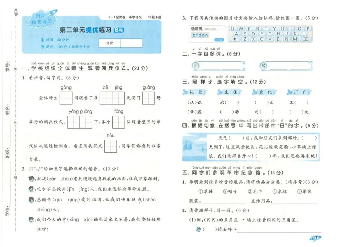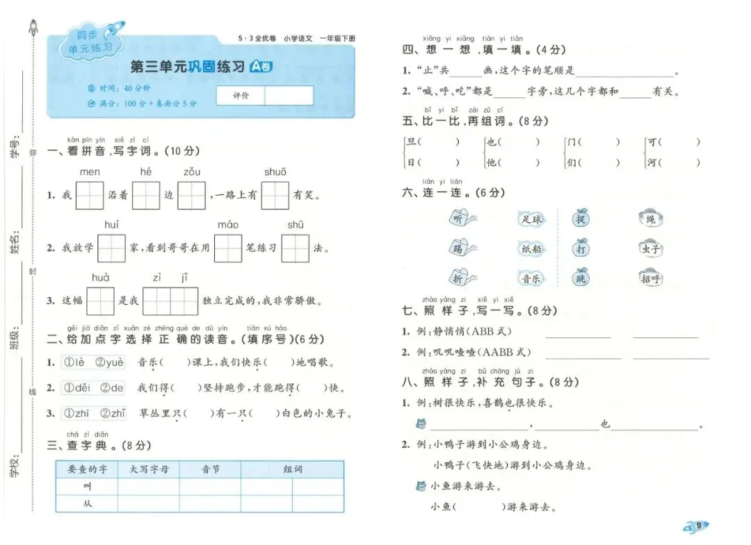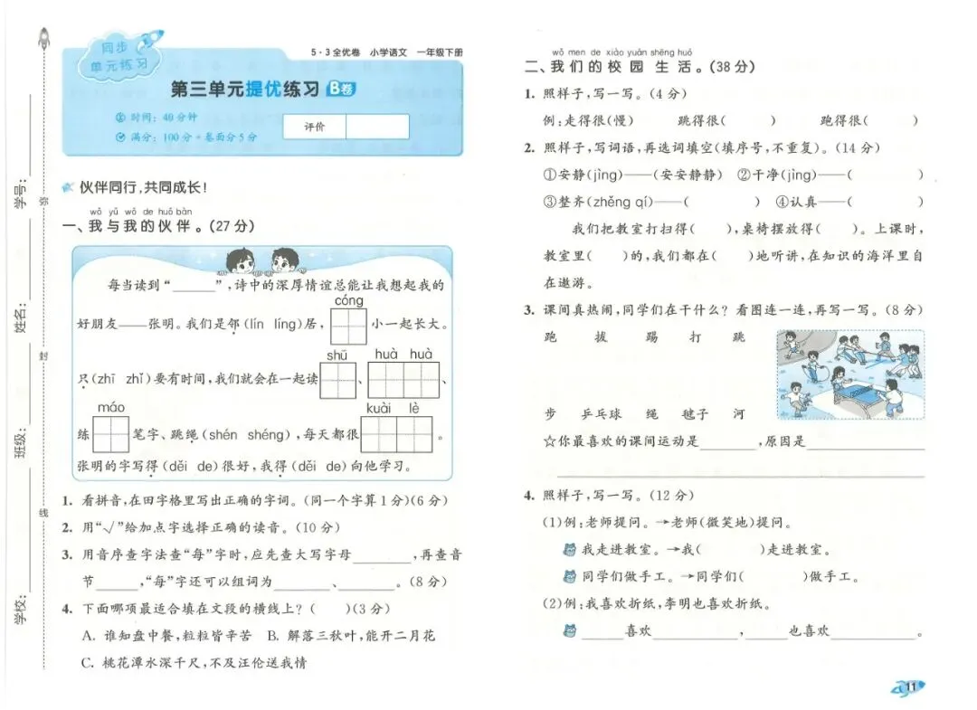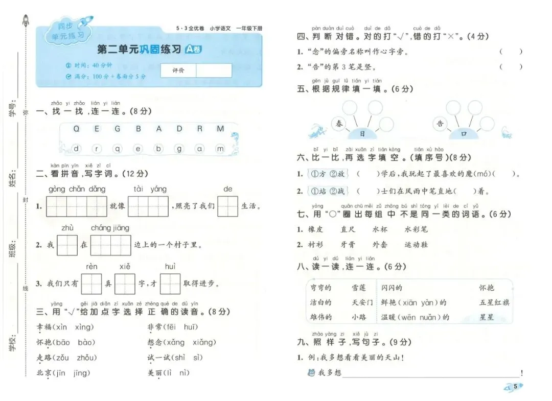 本书采用AB卷分层设计,难度循序渐进,贴合一年级学生认知特点。A卷侧重基础巩固,全面覆盖拼音认读、生字书写、笔顺笔画、组词、形近字、课文背诵、简单句子练习等考点,题型与校内考试高度一致,题量适中,能帮助学生扎实掌握课本内容,适合日常练习与基础薄弱学生巩固。B卷侧重能力提升,增加词语运用、简单阅读理解、看图补充句子等题型,培养学生初步的语感和表达能力,适合学有余力的孩子拓展提优。