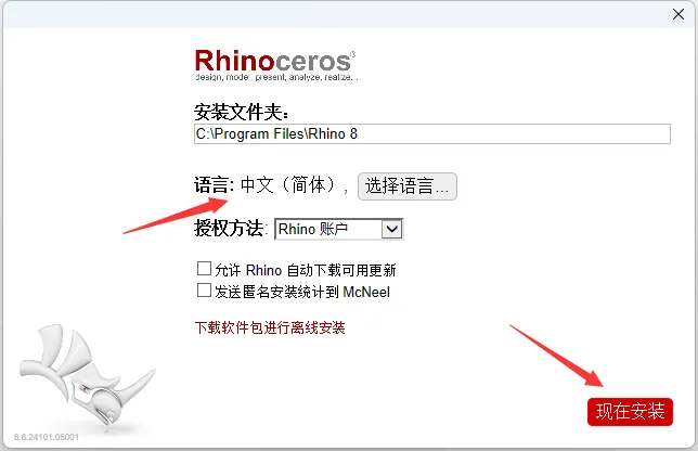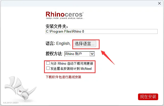 第5步、选择所需要设置的语言,取消勾选自动更新和发送匿名安装统计到McNeel