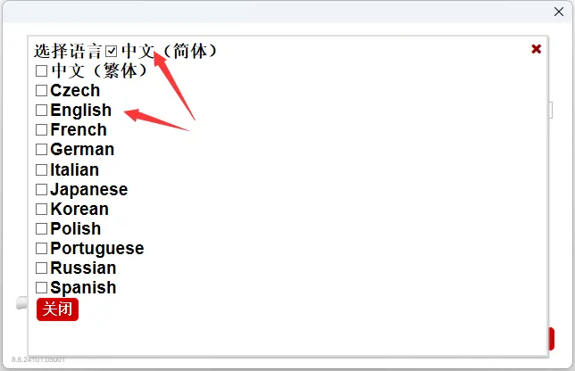 第6步、取消勾选English,勾选中文(简体)再点击关闭