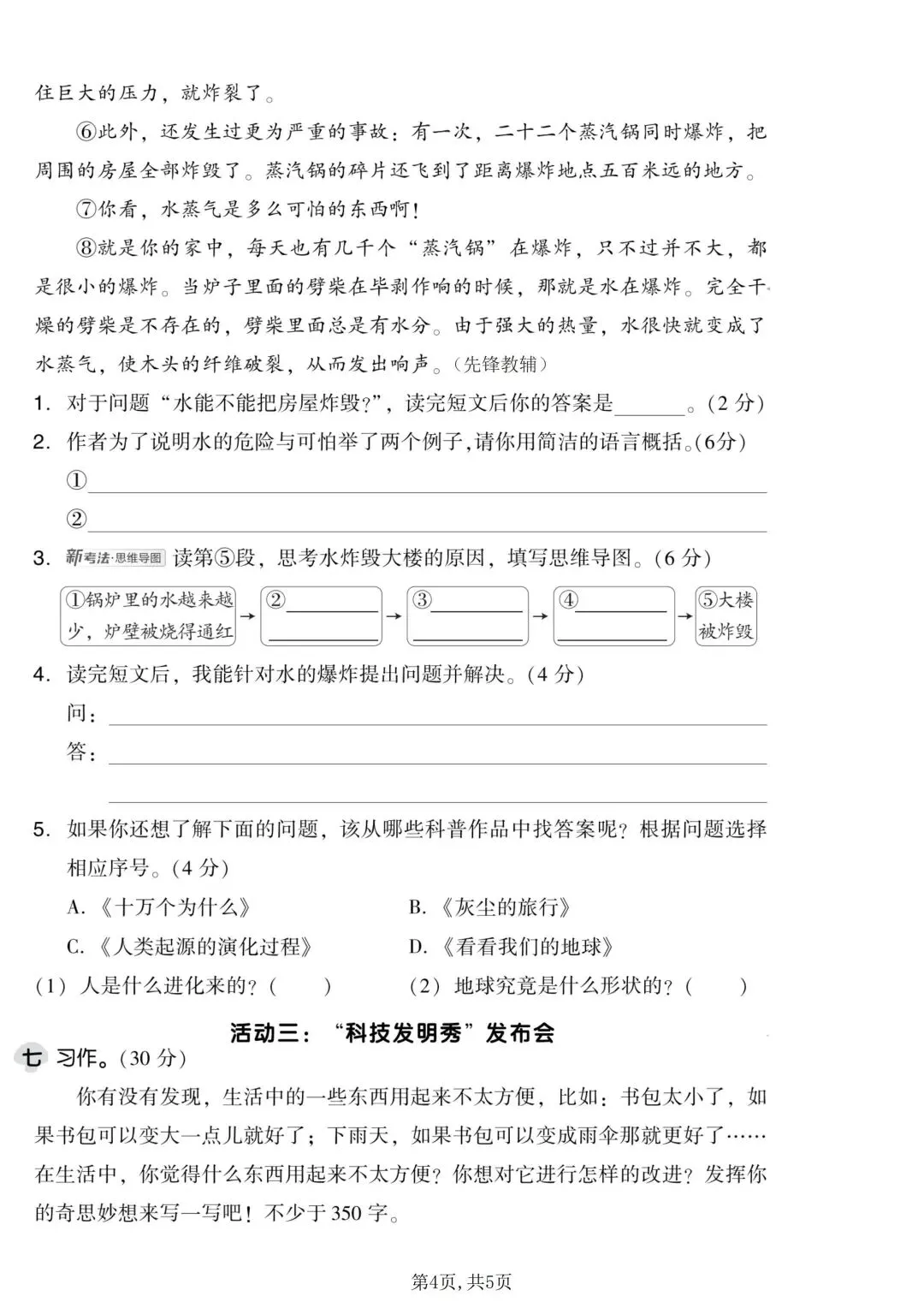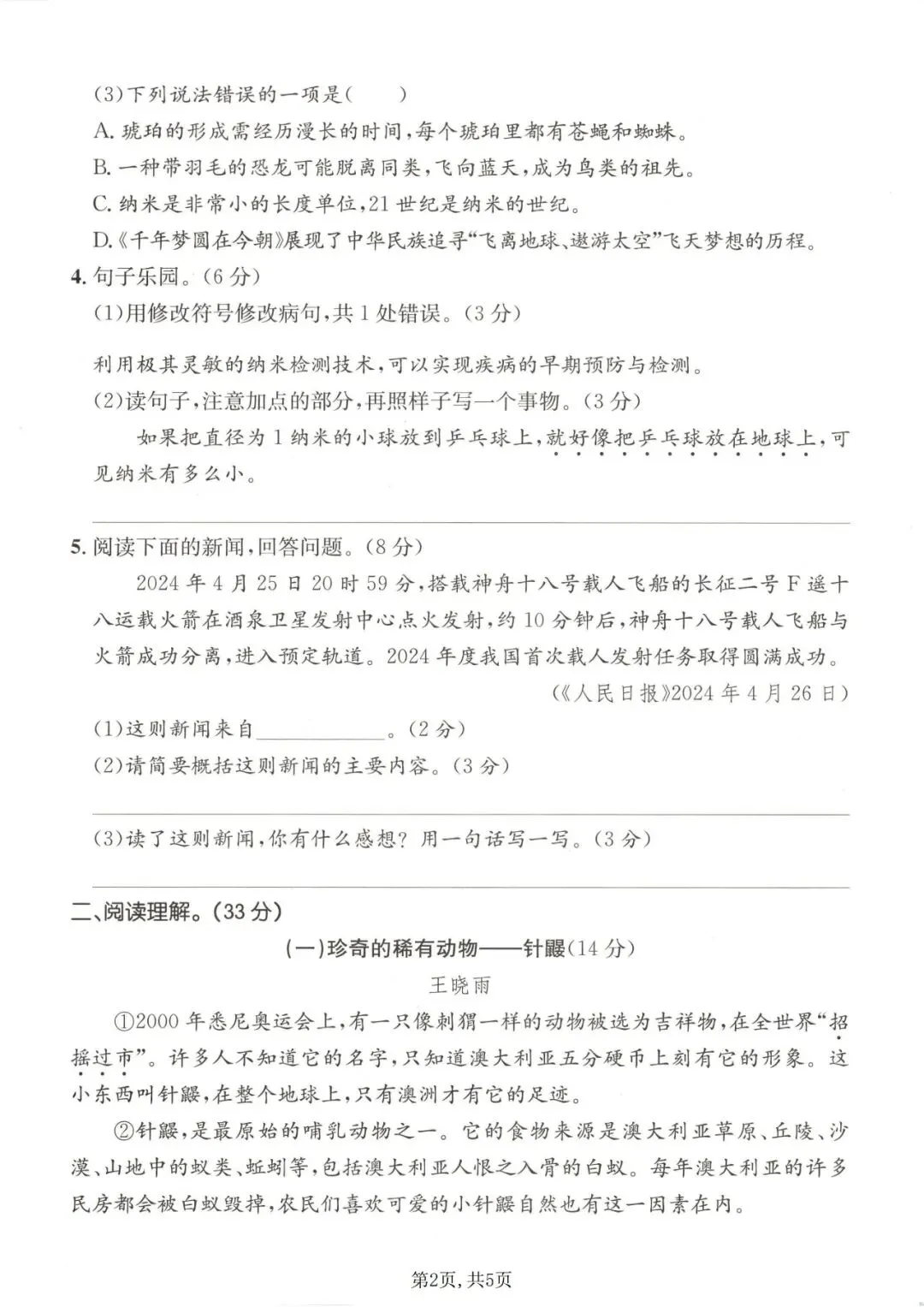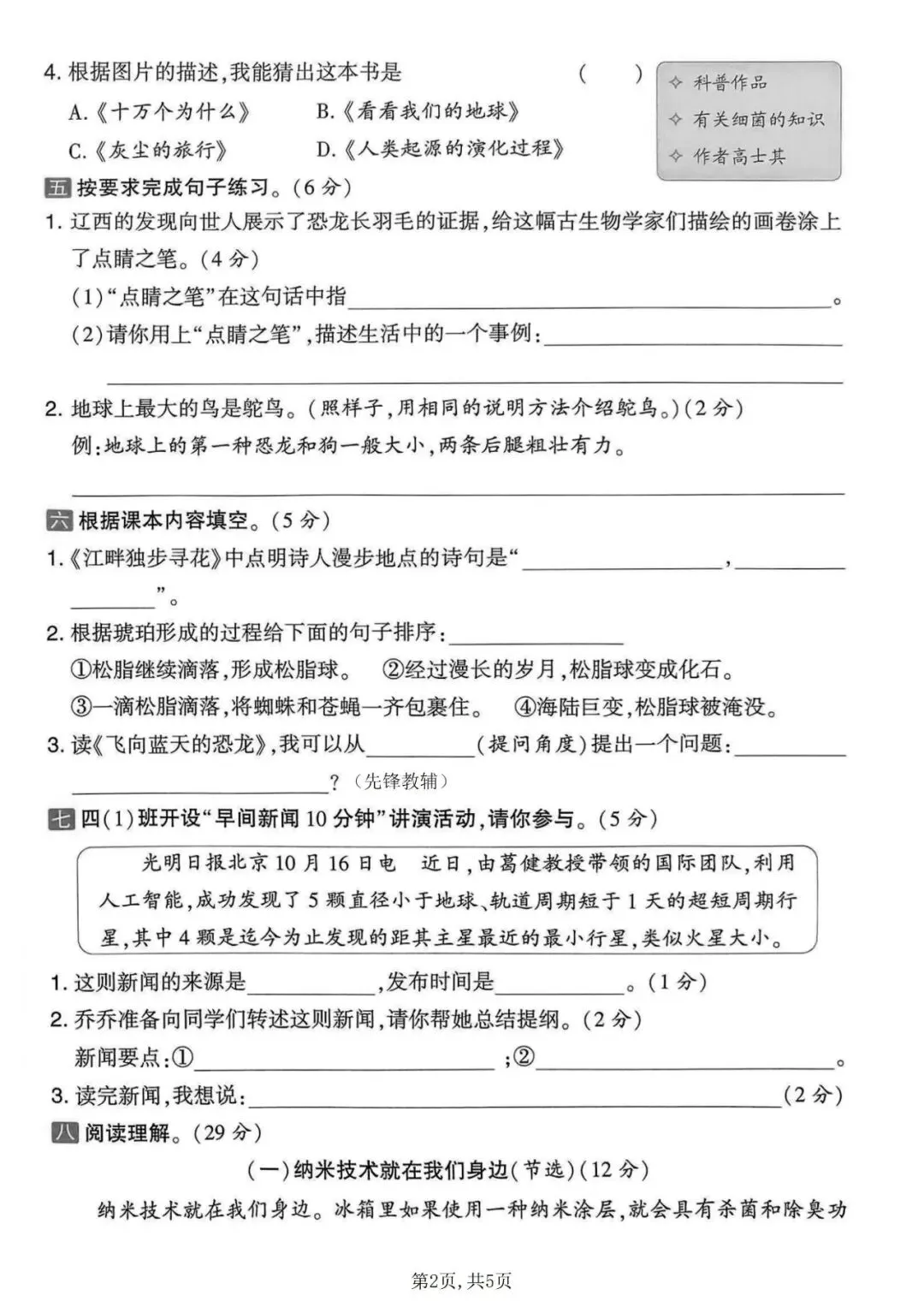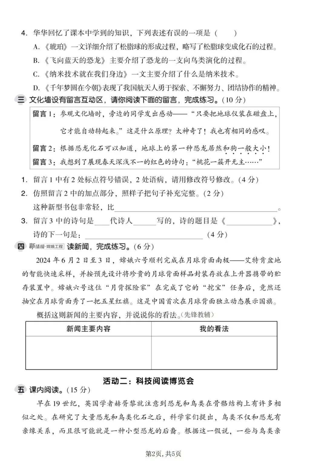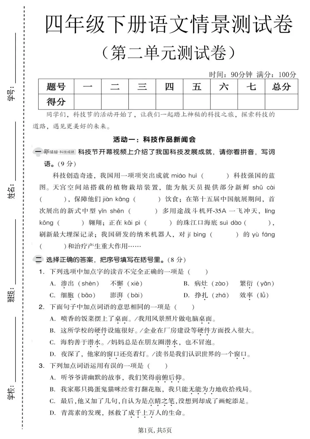 四年级语文下册《第二单元检测卷》5套,可下载打印!
