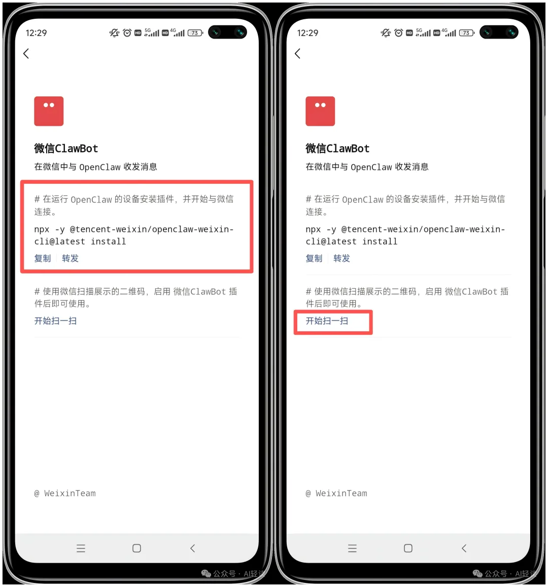 第二步:按指令,在龙虾中安装插件,扫描二维码,添加微信ClawBot