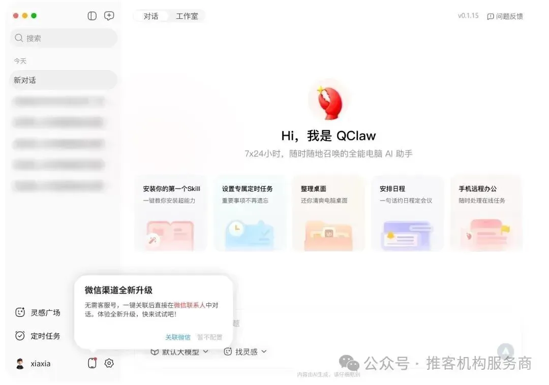 QClaw桌面端(v0.1.15版本)→左下角弹窗→扫码直连
