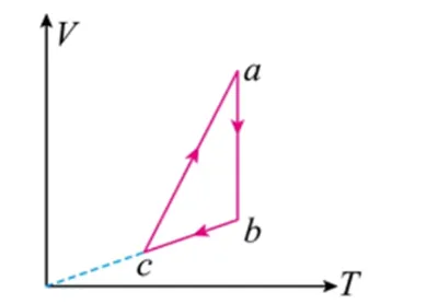 【考查知识点】 气体图像分析与热力学定律。V-T图像中,bc过原点为等压过程,体积减小外界做功;ab等温压缩,内能不变、外界做功,故放热。