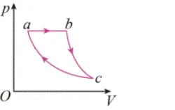 【考查知识点】 热力学定律与循环过程。a→b等压升温,吸热部分用于对外做功、部分增加内能;b→c绝热膨胀,对外做功、内能减少;c→a等温压缩,放热。整个循环内能不变,吸热全部用于对外做功。