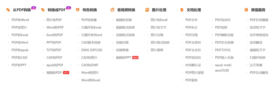 功能:图片处理(抠图、擦除、高清处理、图片压缩、裁剪、GIF压缩、GIF裁剪、修改尺寸、旋转、分割、转Word、转Excel、转PDF、转JPG);PDF处理(合并、分割、压缩、旋转、删页面、更改顺序、转Word、转Excel、转PPT、转图片)