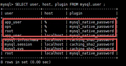 -- 查看用户的认证插件SELECT user, host, plugin FROM mysql.user ;