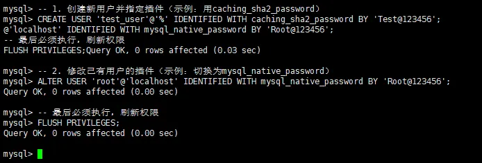 -- 1. 创建新用户并指定插件(示例:用caching_sha2_password)CREATE USER 'test_user'@'%' IDENTIFIED WITH caching_sha2_password BY 'Test@123456';-- 2. 修改已有用户的插件(示例:切换为mysql_native_password)ALTER USER 'root'@'localhost' IDENTIFIED WITH mysql_native_password BY 'Root@123456';-- 最后必须执行,刷新权限FLUSH PRIVILEGES;