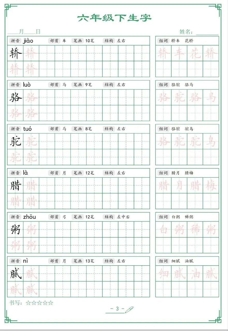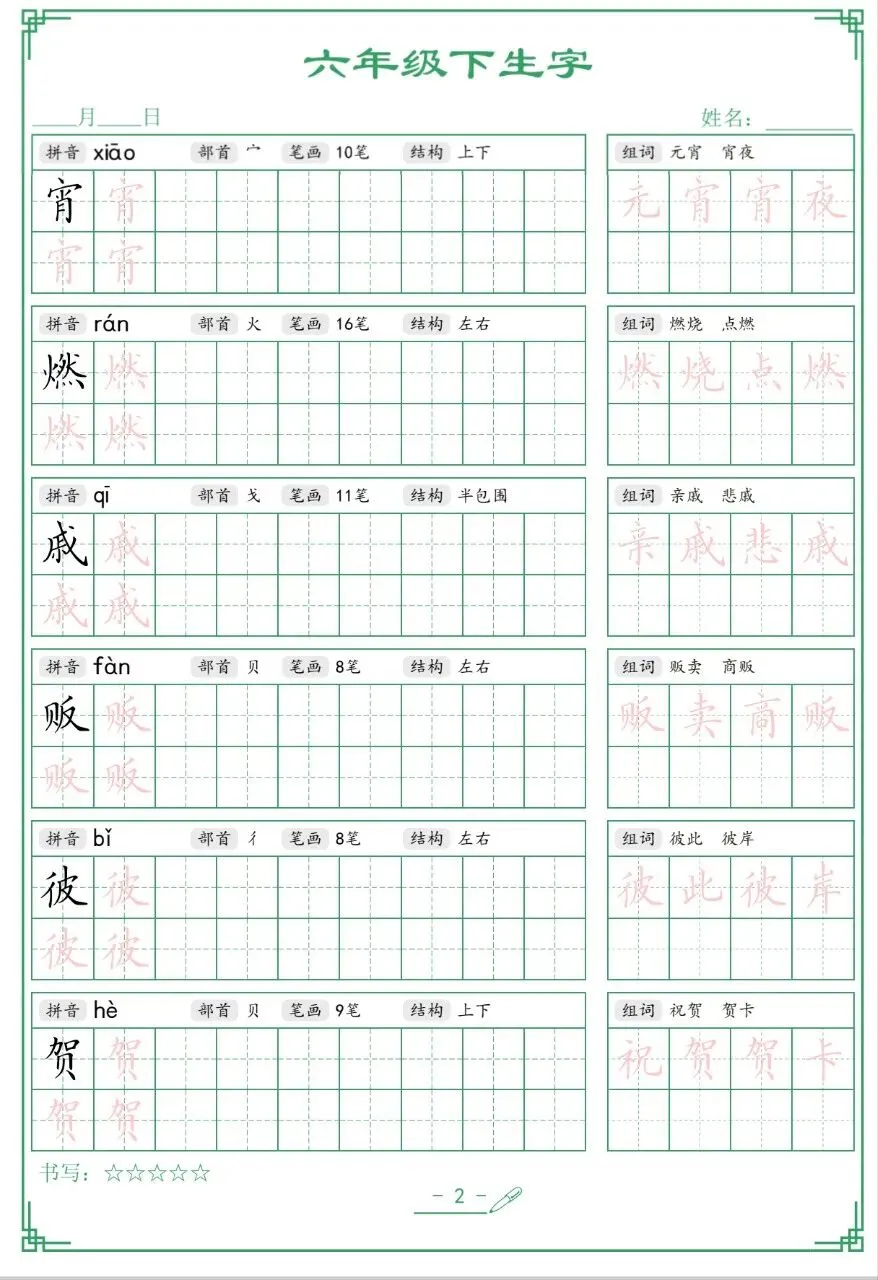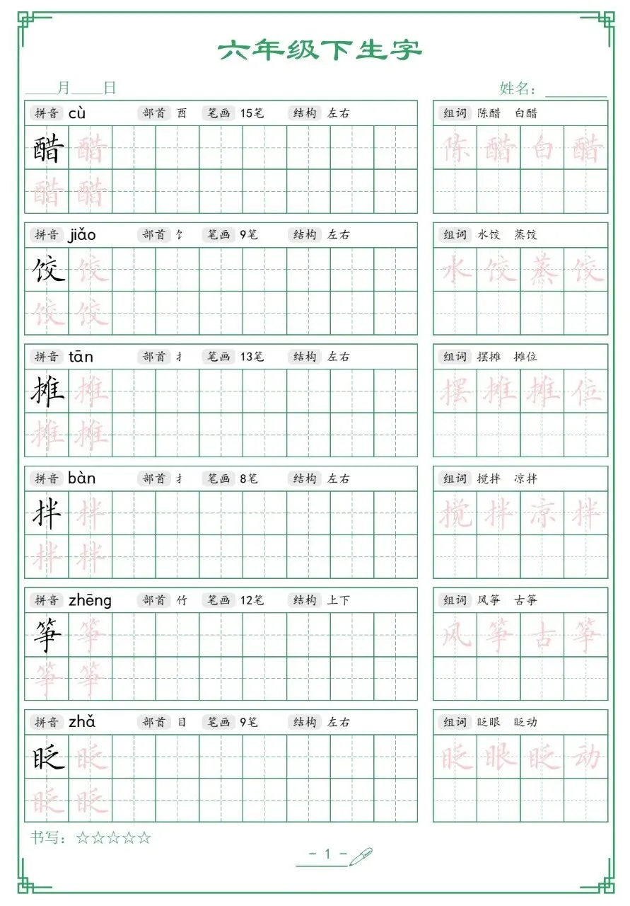 六年级下册语文生字表,文末有完整版电子版免费领取