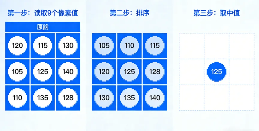 整个实现流程分为三步:首先接收输入的像素数据、同步信号,通过行缓存模块构建3×3窗口;其次对窗口内9个像素值进行排序,筛选出中值;最后将中值作为输出像素,同步输出控制信号,确保时序匹配。设计中需注重流水线优化,使数据处理与输入同步,实现单时钟周期并行处理,提升实时性。
