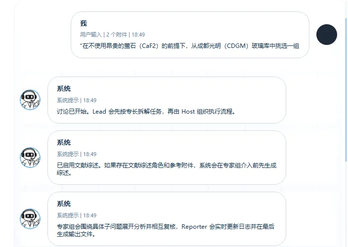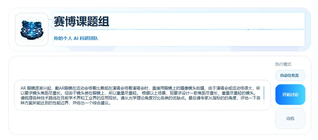 我们把指标也提交给赛博课题组,不指望给出具体内部参数,只需要让AI们讨论出一个技术路线。此时系统会根据用户输入的角色,自动分配让任务: