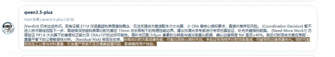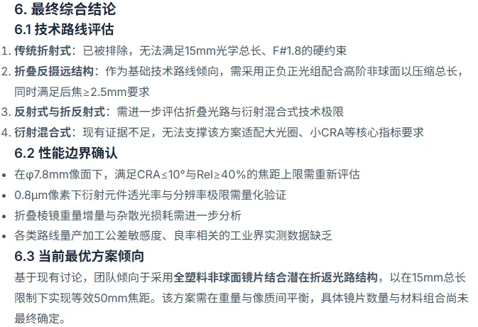 在这个阶段,课题组爆发了极其精彩的“技术路线之争”。有专家激进地提出使用“超构表面(Metasurface)或衍射光学”方案,认为这能把厚度做到微米级;但光机审稿人立刻予以反击,指出在大光圈下,超构表面的边缘衍射效率会断崖式下跌,绝对无法满足边缘相对照度(Rel)的要求,且存在严重的彩虹纹色散。在经历了几轮无情的工程可行性拷问后,AI 们集体向物理约束低头,否决了纯超构表面的幻想,转而给出了更为务实的“全塑料非球面+潜望式折返光路”的综合方案。