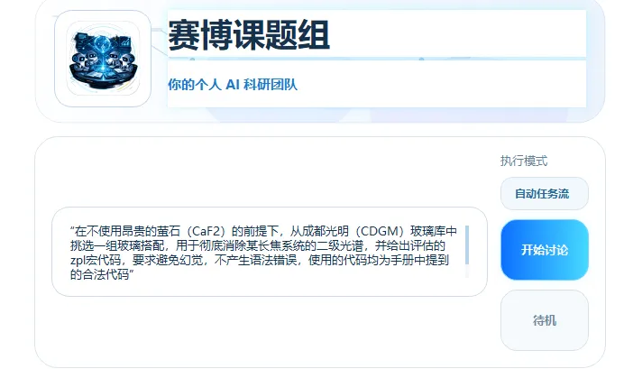 那么,既然一个 AI 容易产生幻觉、思考不全面,如果我召集一群 AI 呢?近期,我接触到了一个非常有意思的开源框架——“赛博课题组”(Cyber Colloquium)。它不是把几个模型塞进同一个对话框里乱聊,而是真正构建了一支按 workflow 科学分工的 AI 研究系统。你可以设定一位“主设计师”,一位擅长挑刺的“公差审稿人”,以及一位“光机结构专家”,让他们针对同一个棘手的光学指标进行循环辩论、复核与纪要沉淀。