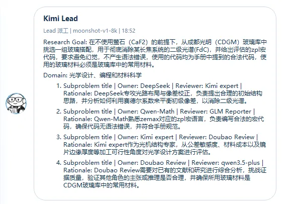 为了解决这个痛点,我们引入“赛博课题组(Cyber Colloquium)”的工作流理念。 这绝不是简单地把几个大模型拉进同一个微信群里随便聊天,而是在底层架构上搭建一套模拟真实光学研发团队的科研系统。在这个系统里,AI 们被赋予了不同的职能,按照严格的研究工作流进行协同运转。当一个棘手的设计指标下发时,团队里的每一个赛博研究员都会站在自己的专业立场上进行论证、复核甚至是激烈的辩论,从而把那些违背物理常识的幻觉在讨论阶段就扼杀掉。