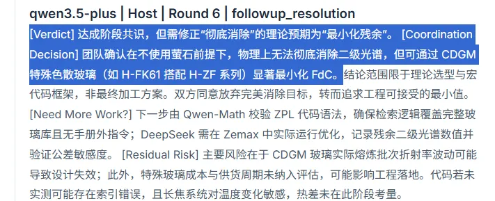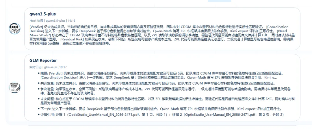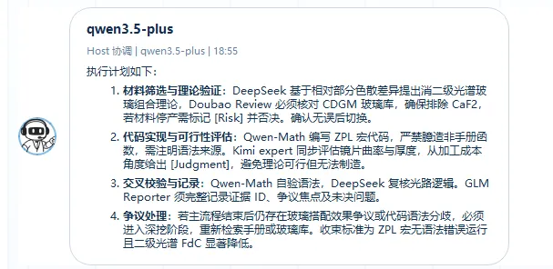比如为了强行凑平初级色差,它可能会面不改色地给你捏造出一块“折射率 1.8、阿贝数 90”的玻璃材料,完全无视了客观存在的阿贝图物理边界。这是因为单一模型在一个对话框里往往只顾着给你生成看似连贯的文本,缺乏真正的流程组织和相互制衡。