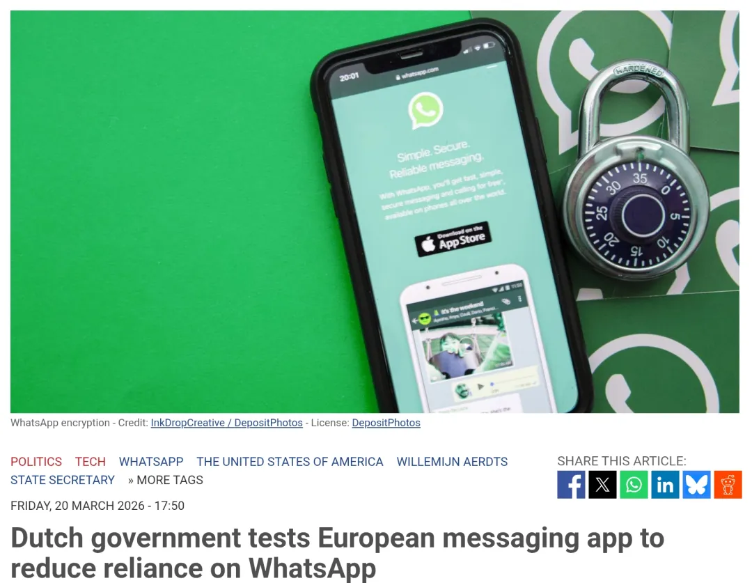 荷兰政府正悄然推进一项数字主权计划。近日,负责数字经济与主权事务的国务秘书Willemijn Aerdts表示,政府过度依赖像WhatsApp和Signal这样的外国通讯应用,已构成潜在风险。为此,其部门已启动一项试点项目,测试一款欧洲本土即时通讯应用,作为替代方案的第一步。