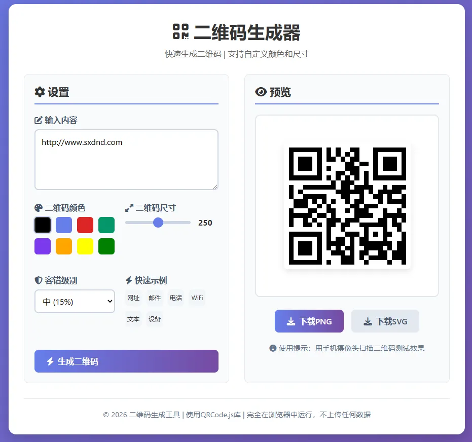 2、输入你需要转化的文本,就可以快成二维码。也可以在快速示例中点击例子,修改示例后生成(尤其是像电话、邮箱和WIFI,它们具有特定的格式)。