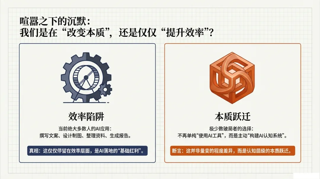 我并非否定「效率提升」的价值,效率提升是AI落地的基础红利。但我想点明一个更关键的趋势:当多数人忙于用AI工具优化效率时,另一批从业者正在布局完全不同的赛道——他们并非单纯「使用AI工具」,而是主动「构建AI认知系统」。这两种行为的差距,并非量变的程度差异,而是认知层级的本质跃迁。