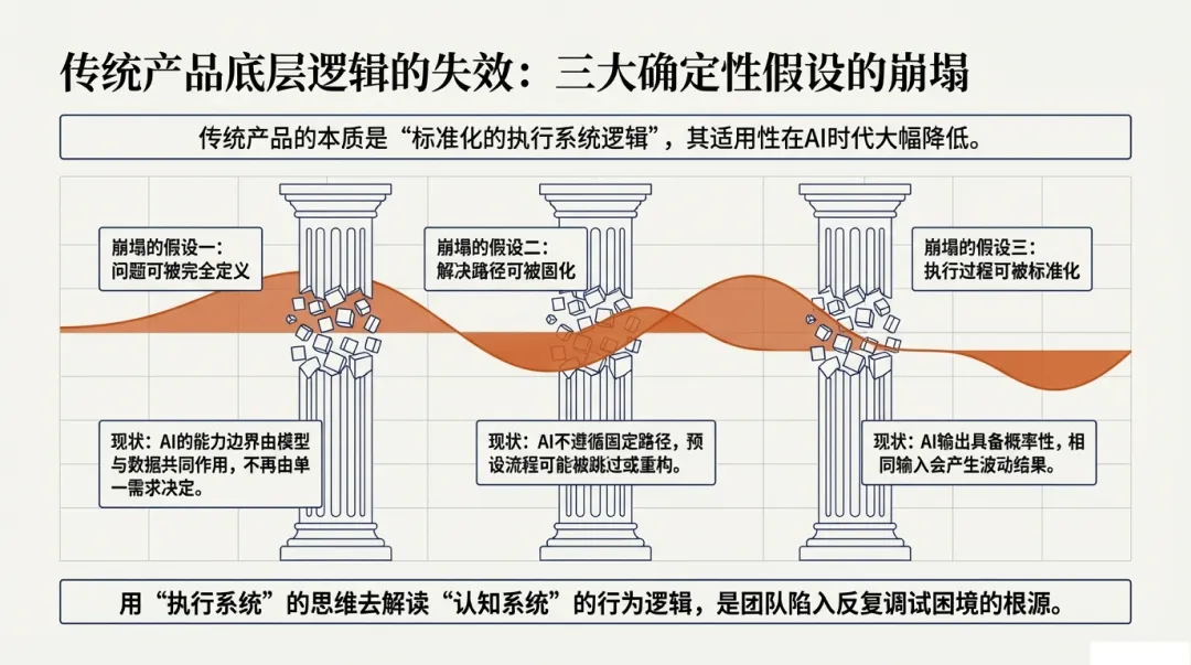 然而,当AI融入产品核心架构后,这三大假设同步松动,传统逻辑的适用性大幅降低。