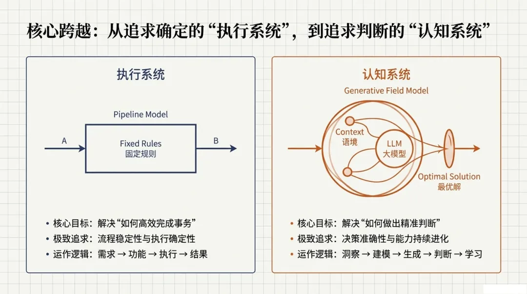 理解AI产品的核心,必须完成一次认知范式切换:从「执行系统」思维,转向「认知系统」思维。执行系统解决的是「如何高效完成事务」的问题,核心追求流程稳定性与执行确定性;认知系统解决的是「如何做出精准判断」的问题,核心追求决策准确性与能力持续进化。二者并非简单的迭代升级关系,而是底层逻辑的根本性差异。