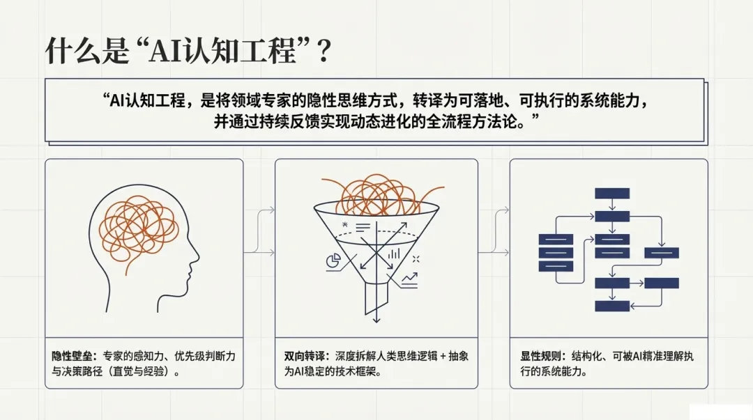 用一句话精准界定:AI认知工程,是将领域专家的隐性思维方式,转译为可落地、可执行的系统能力,并通过持续反馈实现动态进化的全流程方法论。