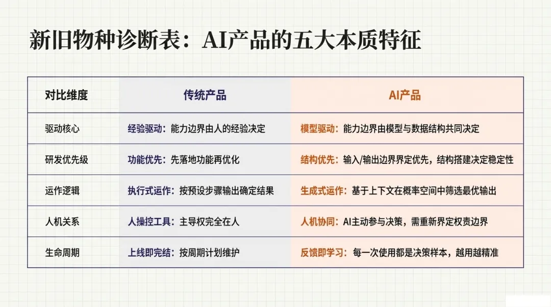 整合五大特征,可清晰总结两类产品的核心差异:传统产品以「执行确定性」为核心,AI产品以「认知持续进化」为核心。两类路径的极简对比如下: